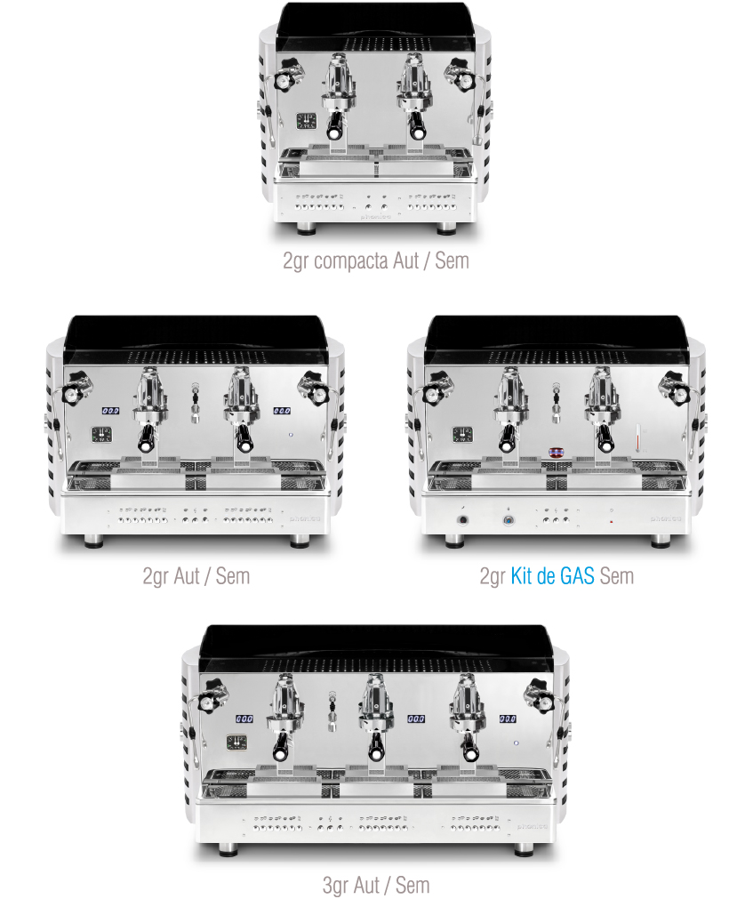 Todos los modelos están disponibles en versiones automáticas y semiautomáticas, equipados con manómetro de doble escala para visualizar la presión de la caldera y de la bomba, bomba volumétrica profesional (2 gr. compacta 150 L/h, 2-3 gr. 200 L/h), carga automática y manual de agua de la caldera, motor enfriado por agua, caldera con brida de cobre con grifo de drenaje manual (excepto en el modelo 2 gr. compacta), tuberías de cobre y conexiones de latón, termostato de bulbo capilar protector de la resistencia, carrocería de acero inoxidable pulido y satinado AISI 304 con acabados en metacrilato.