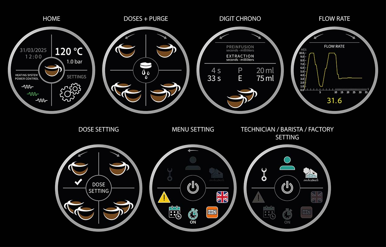 alarm alerts, bar's day off, language, turning the machine on/off, counter page, electric cup heater (with ON/OFF switch) with programmable working temperature, customizing the barista password, adjusting the sensitivity of the level probe based on the hardness of the water, programming and warning of maintenance cycles, filter replacement, boiler load synchronization, maximum boiler load time.